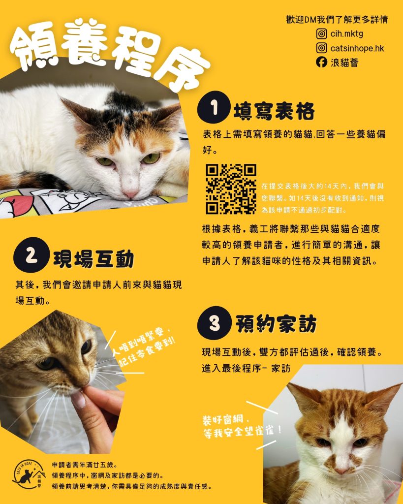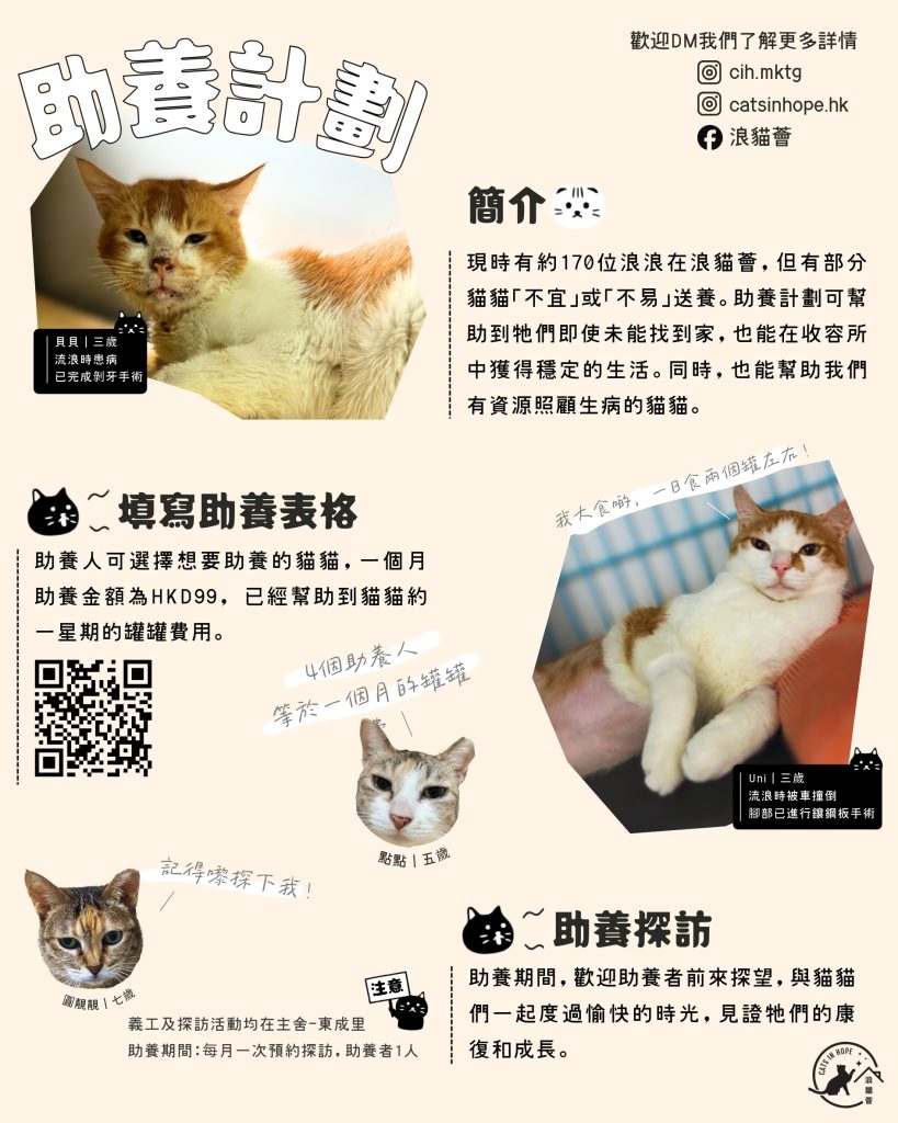 助養及領養計劃 助養計劃是一種持續支持我們貓住客們的方式。通過參與助養計劃,您每個月支付99元的費用,以支援一位特別需要關注的貓住客的生活開支。通過領養計劃,您不僅為這些貓住客提供了一個美好的家,還為我們創造了更多空間,可以照顧更多需要幫助的貓貓。 請支持我們的救援 浪貓薈主要的救援行動是救助因政府收地而失去樓身之地的流浪貓,現時已收容了過百位貓住客。因此,大眾的支持十分重要!除了領養及助養計劃,您亦可透過捐款以作支援貓住客們的日常開支及醫療費用。 🔗捐款連結