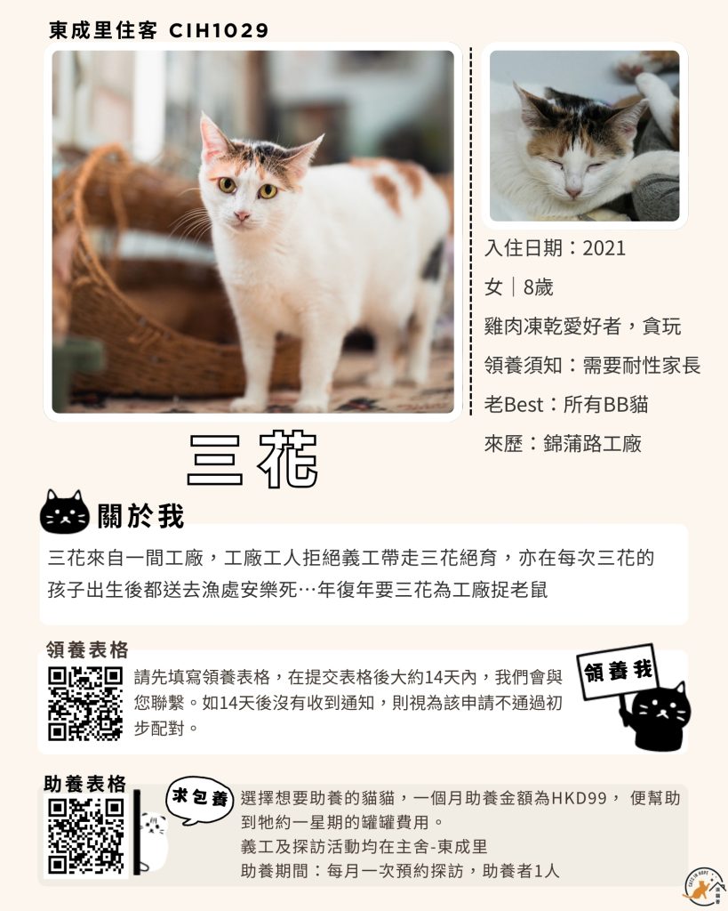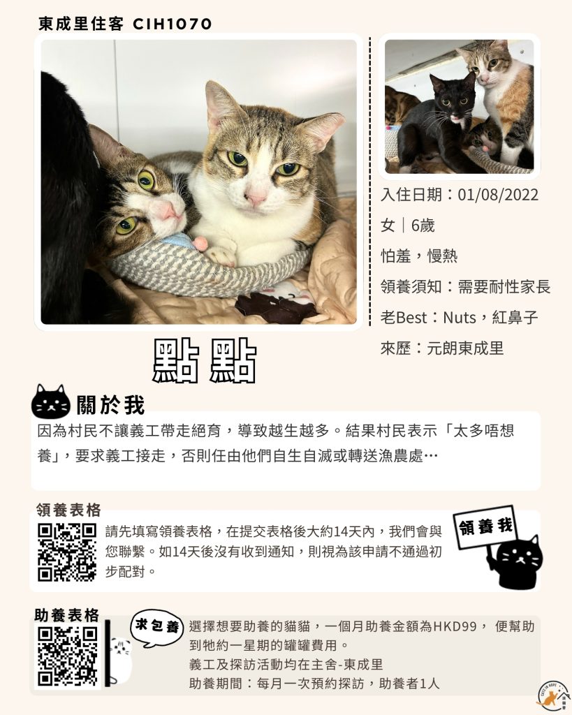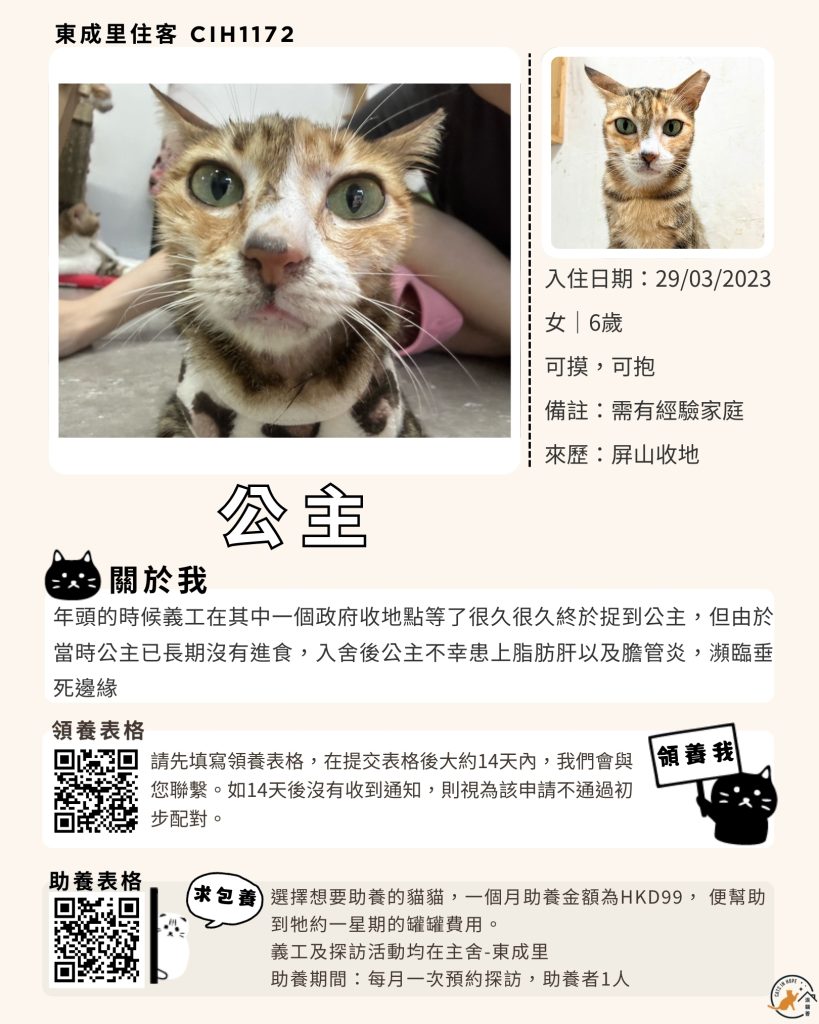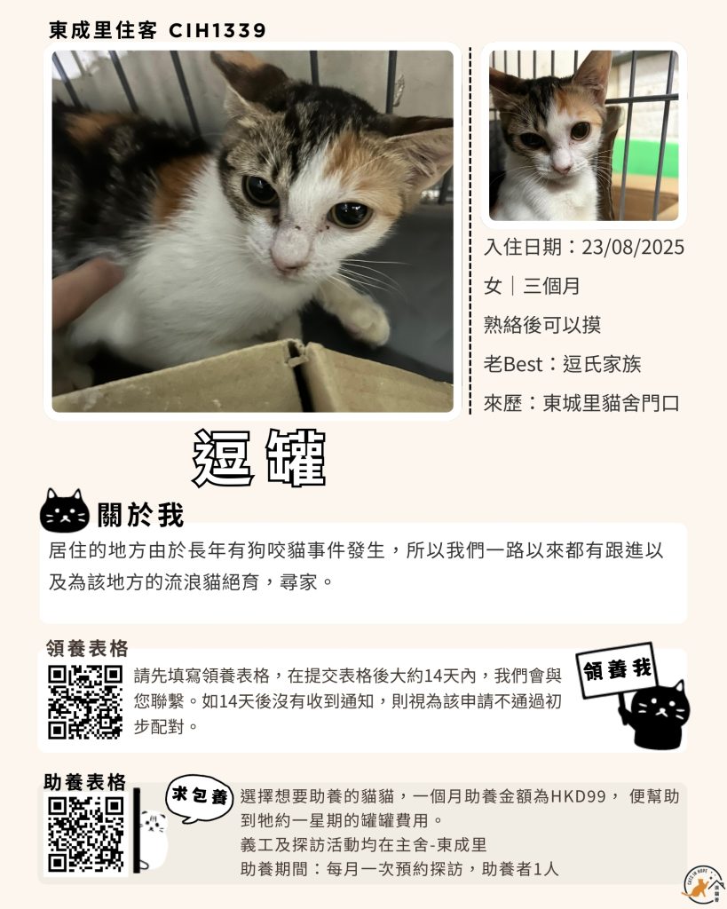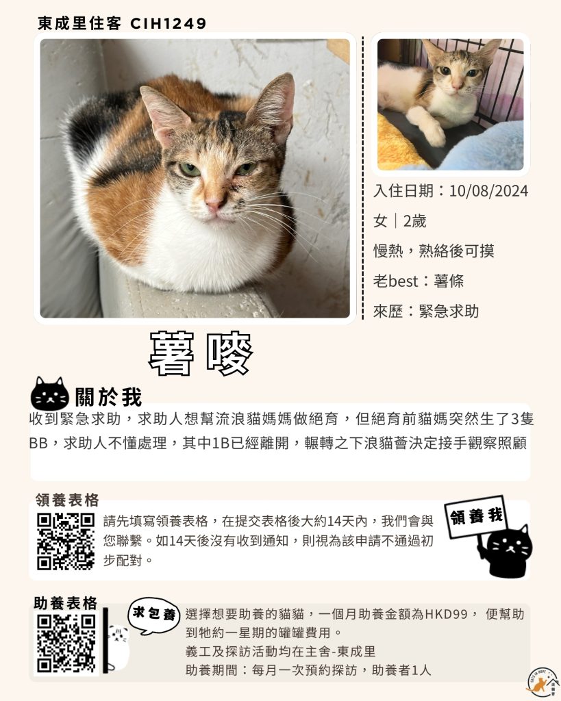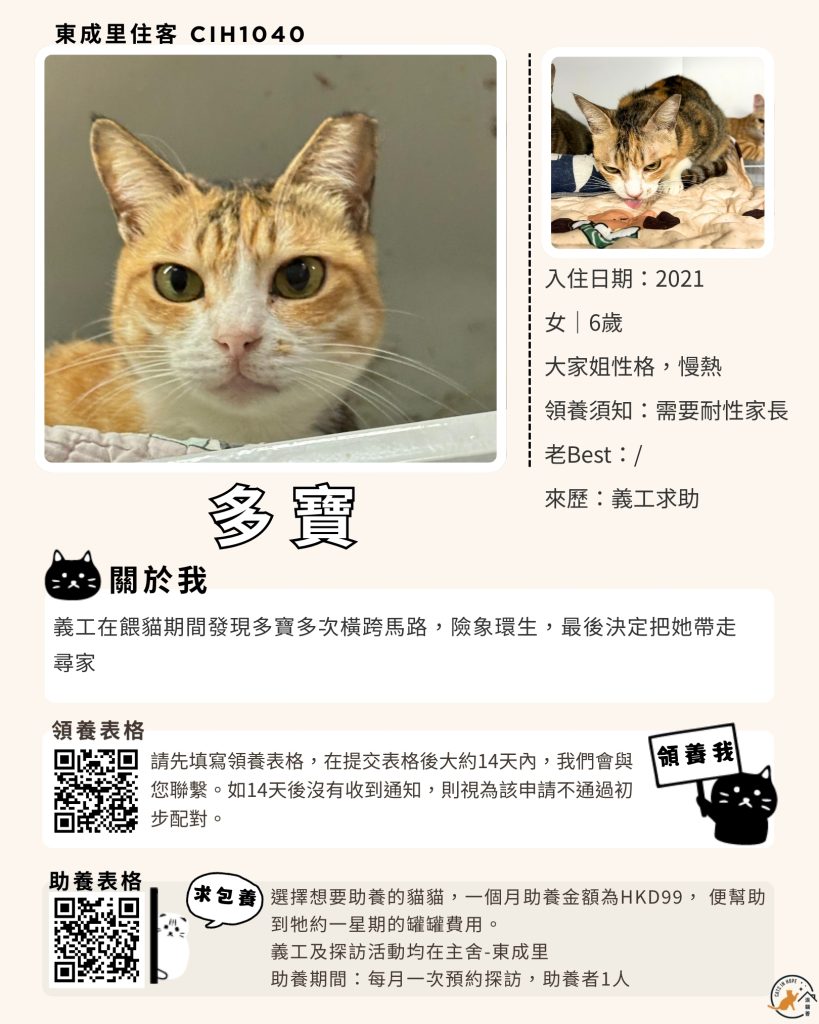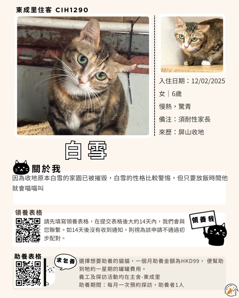 領養表格 助養表格 東成里住客 三色帶紋|三花色|玳瑁色 SILVER 三花 大咪 MIU MIU 點點 花呢碌 L妹 圓靚靚 芝琳 多寶 公主 美人 小咪 泰Q MANGO 糖不甩 TROUBLE 薯條 白雪 逗罐