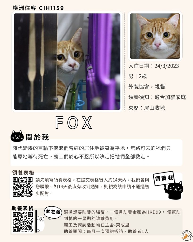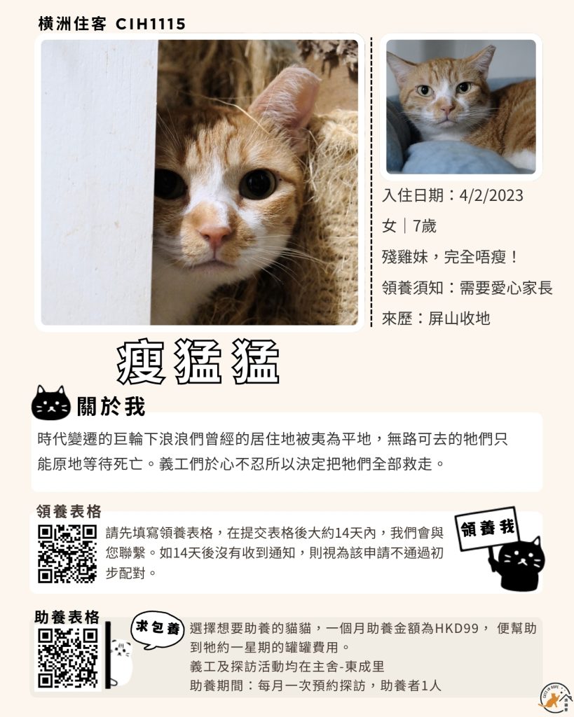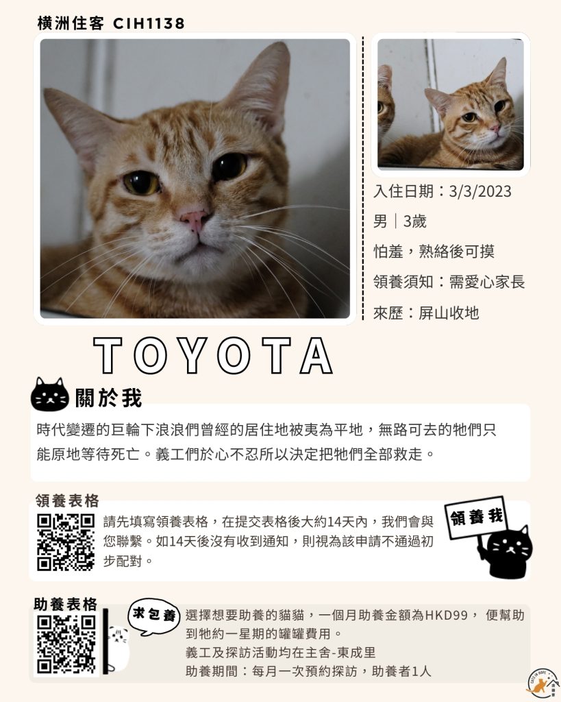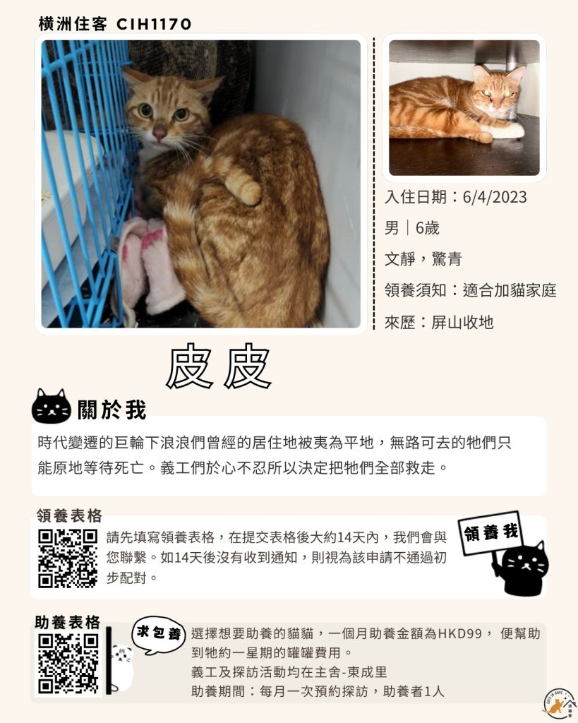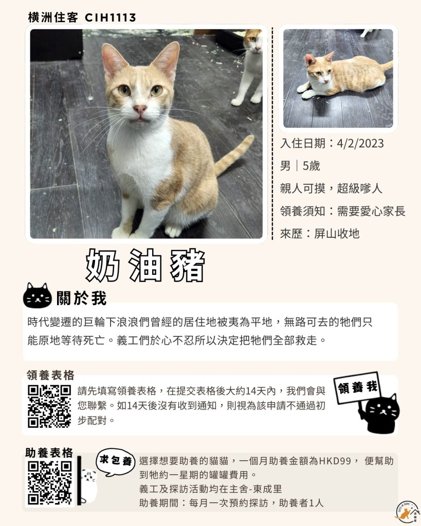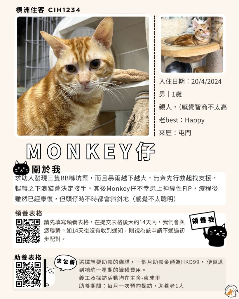 領養表格 助養表格 橫洲住客 橘色|橘白色 鹹蛋 奶油豬 瘦猛猛 閃閃 周星星 珠寶 金寶 飛飛 大眼仔 嘟嘟 TOYOTA 小雨 豬仔包 凱兒 三上 阿木 FOX BOBO 皮皮 右仔 MONKEY仔 黃生 小王子 阿嘈 阿呆 阿仔 阿TICK 道生 PIE PIE 金桔