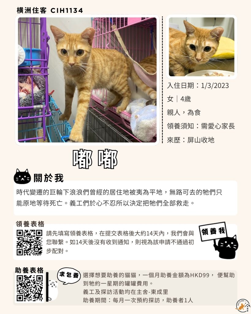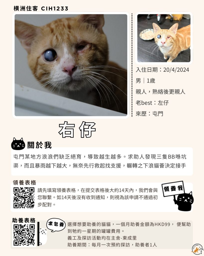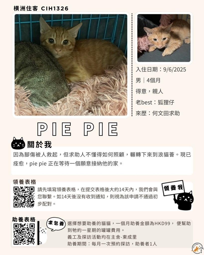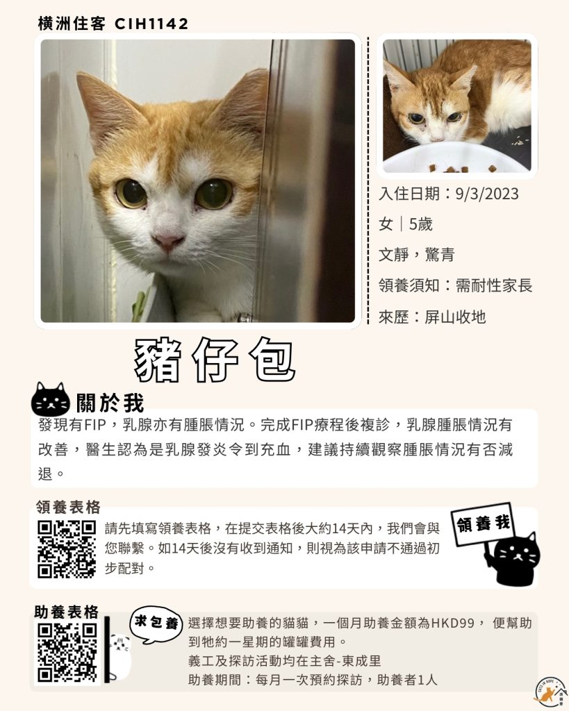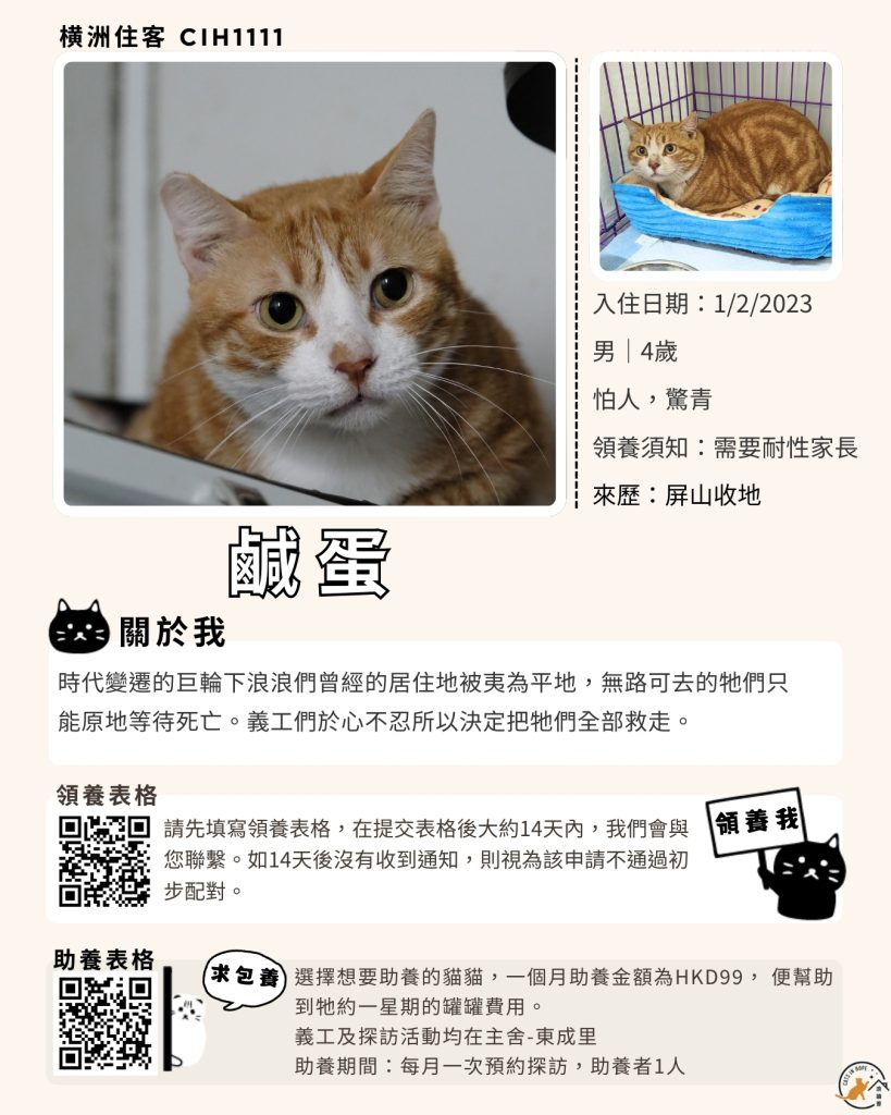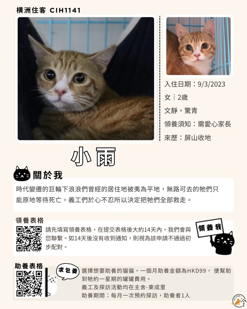 領養表格 助養表格 橫洲住客 橘色|橘白色 鹹蛋 奶油豬 瘦猛猛 閃閃 周星星 珠寶 金寶 飛飛 大眼仔 嘟嘟 TOYOTA 小雨 豬仔包 凱兒 三上 阿木 FOX BOBO 皮皮 右仔 MONKEY仔 黃生 小王子 阿嘈 阿呆 阿仔 阿TICK 道生 PIE PIE 金桔