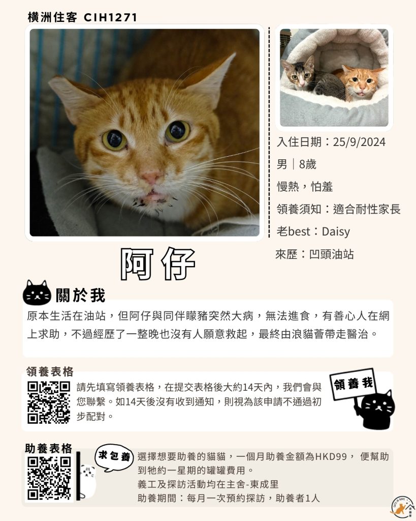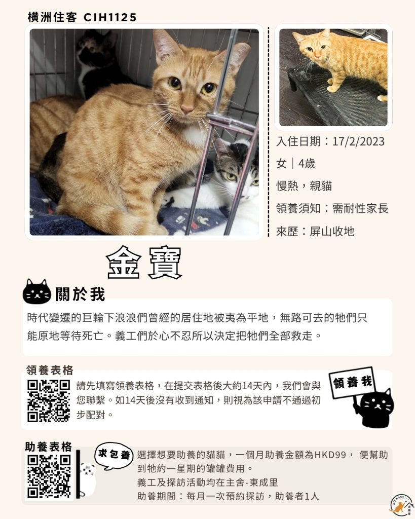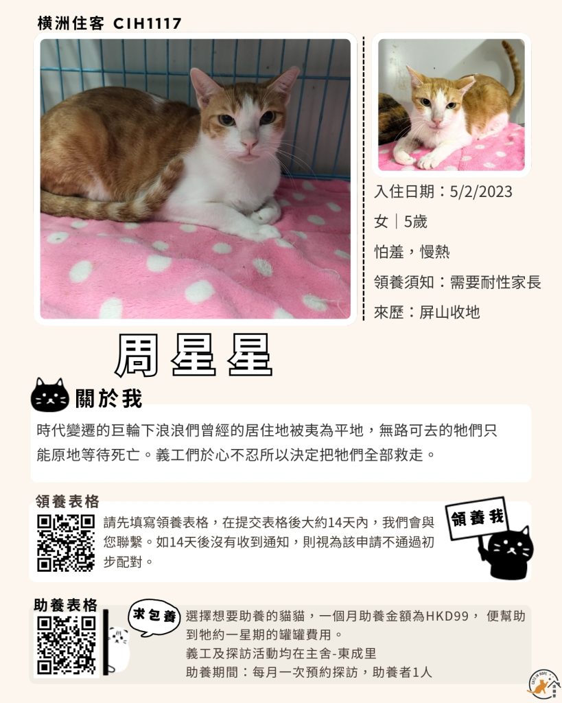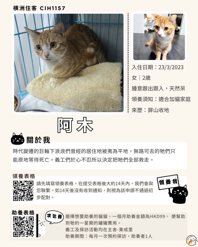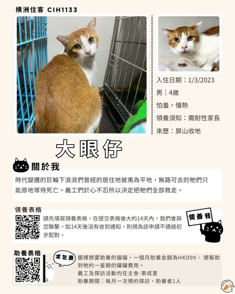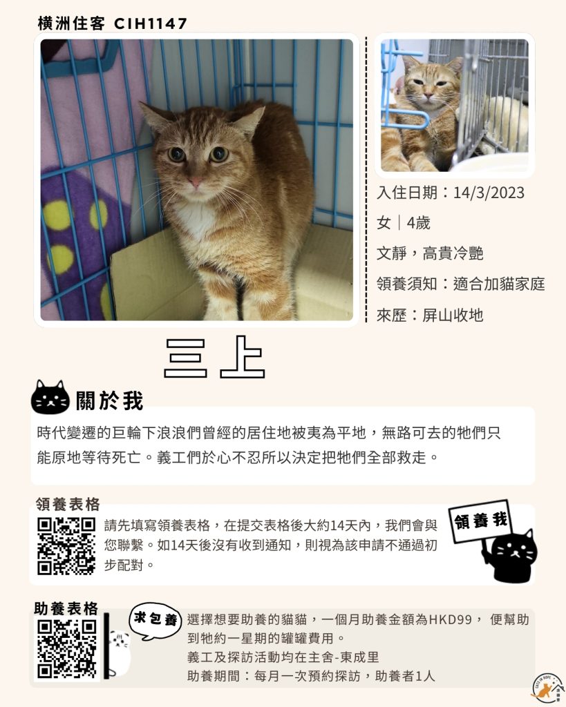 領養表格 助養表格 橫洲住客 橘色|橘白色 鹹蛋 奶油豬 瘦猛猛 閃閃 周星星 珠寶 金寶 飛飛 大眼仔 嘟嘟 TOYOTA 小雨 豬仔包 凱兒 三上 阿木 FOX BOBO 皮皮 右仔 MONKEY仔 黃生 小王子 阿嘈 阿呆 阿仔 阿TICK 道生 PIE PIE 金桔